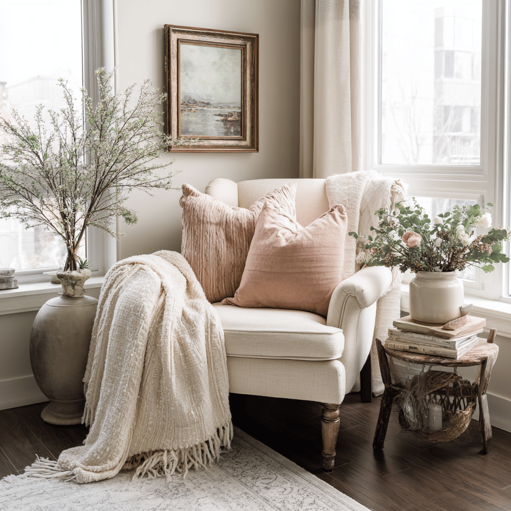 Side tables get similar treatment but on a smaller scale. A simple blush ceramic bud vase with a single cream rose, a cream candle, and perhaps a small decorative object in coordinating colors keeps these surfaces from feeling neglected while maintaining a clean, uncluttered appearance. Remember, negative space is just as important as the decorated areas.