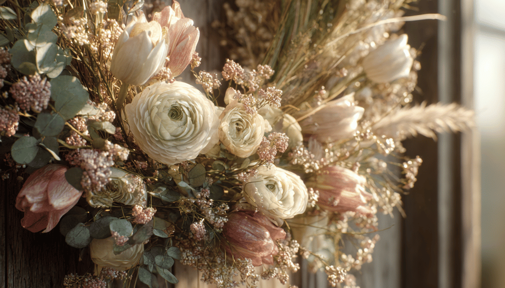 I love wreaths made with real or faux flowers like peonies, ranunculus, tulips, and hydrangeas. Greenery wreaths with a few blooms tucked in feel elegant and not overdone. Eucalyptus and lamb’s ear paired with pastel flowers have a soft, sophisticated quality that I adore.